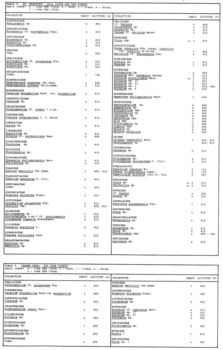 The herb layer was dominated by an acaulus Pandanus sp. and Dianella ensifolia. Two Bulbophyllum species and a Selaginella sp. grew as lithophytes in exposed areas. Nepenthes philippinensis formed dense mats on the exposed rocks of the cliff tops and at the forest edge on the south-facing side of the ridge. A stemless Pandanus formed dense patches on the ridge's north side. Calamus foxworthyi was collected here for the first time on Palawan since 1906.