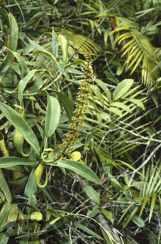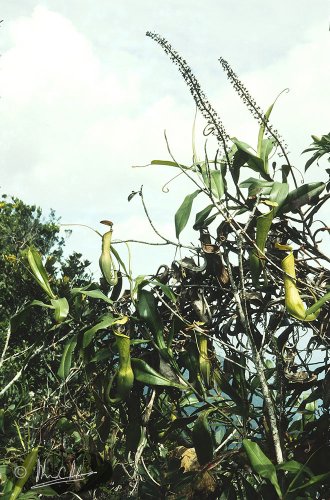 Nepenthes philippinensis formed dense mats on the exposed rocks of the cliff tops and at the forest edge in mull-ridge, gap, upper montane rainforests and dry-peak forests from the Mt. Pulgar (Thumb Peak)/Mt. Beaufort area to south of Mt. Victoria. Nepenthes philippinensis was abundant over 600m, particularly as a terrestrial exposed to the full sun. It was particularly abundant in the Mt. Victoria area. Hanging pitchers tended to be green and elongated, while the ground pitchers were red and fatter. Flowering plants were often seen.
