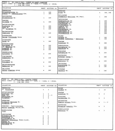 Only two patches of this community totalling not more than 4 ha (fig. 8, locality 37 b, c) were found within the National Park. The strand community was dominated by exceptionally large specimens of Calophyllum inophyllum. At locality 37 b, the massive trees, 80 - 100 cm in diameter at breast height and 35 - 40 m were identified as Pometia pinnata and Palaquium dubardii. See table 14 for further details. Unfortunately the remaining species remain unknown.